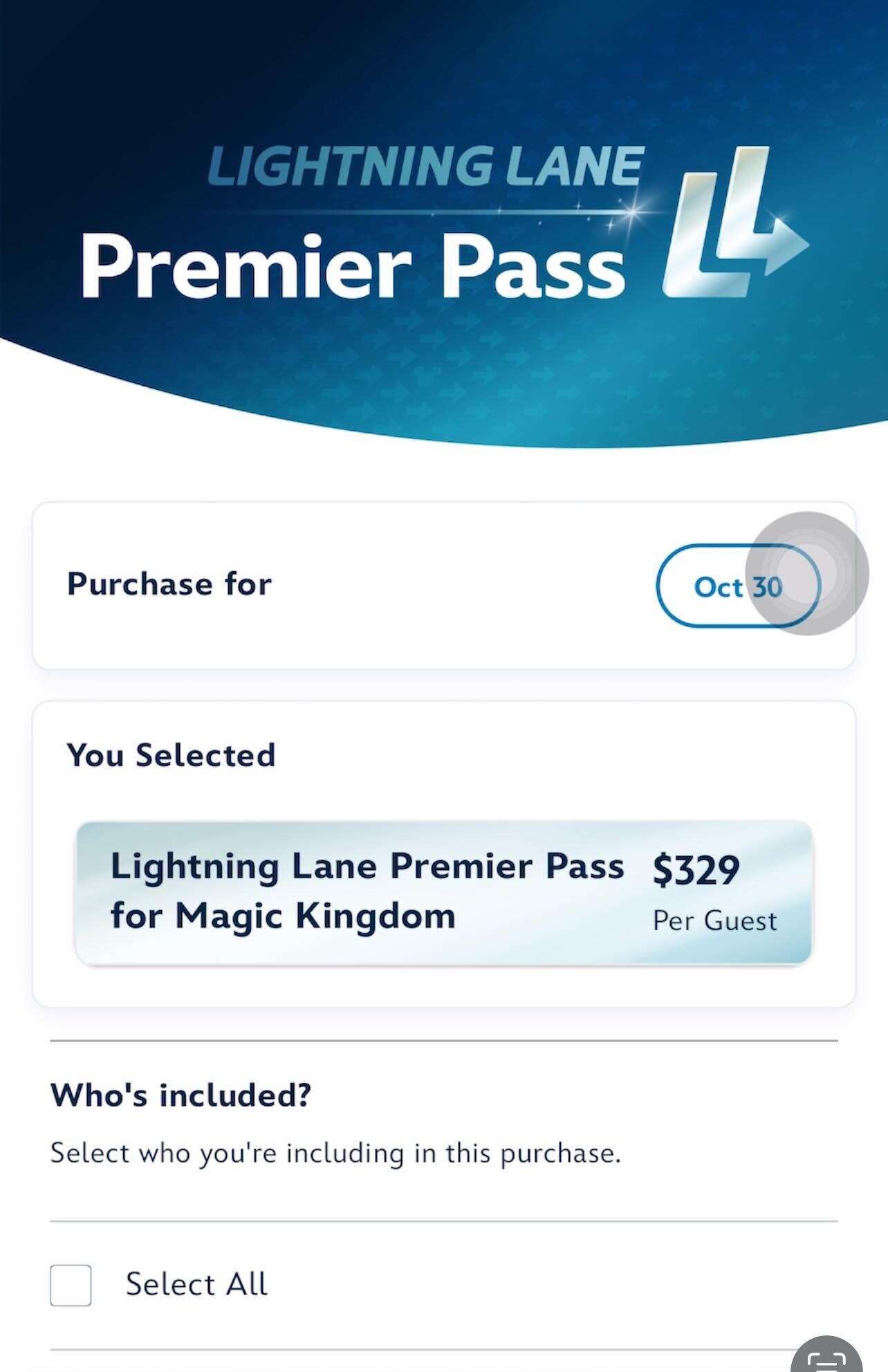 As a reminder, it is critical to have everyone at your party linked to your family and friends list so you can make the purchase for everyone in your party. (If you are unfamiliar with the process of linking your traveling Party, we explain the process here. Again, the price for Premier Pass is per person in your group, per day.)