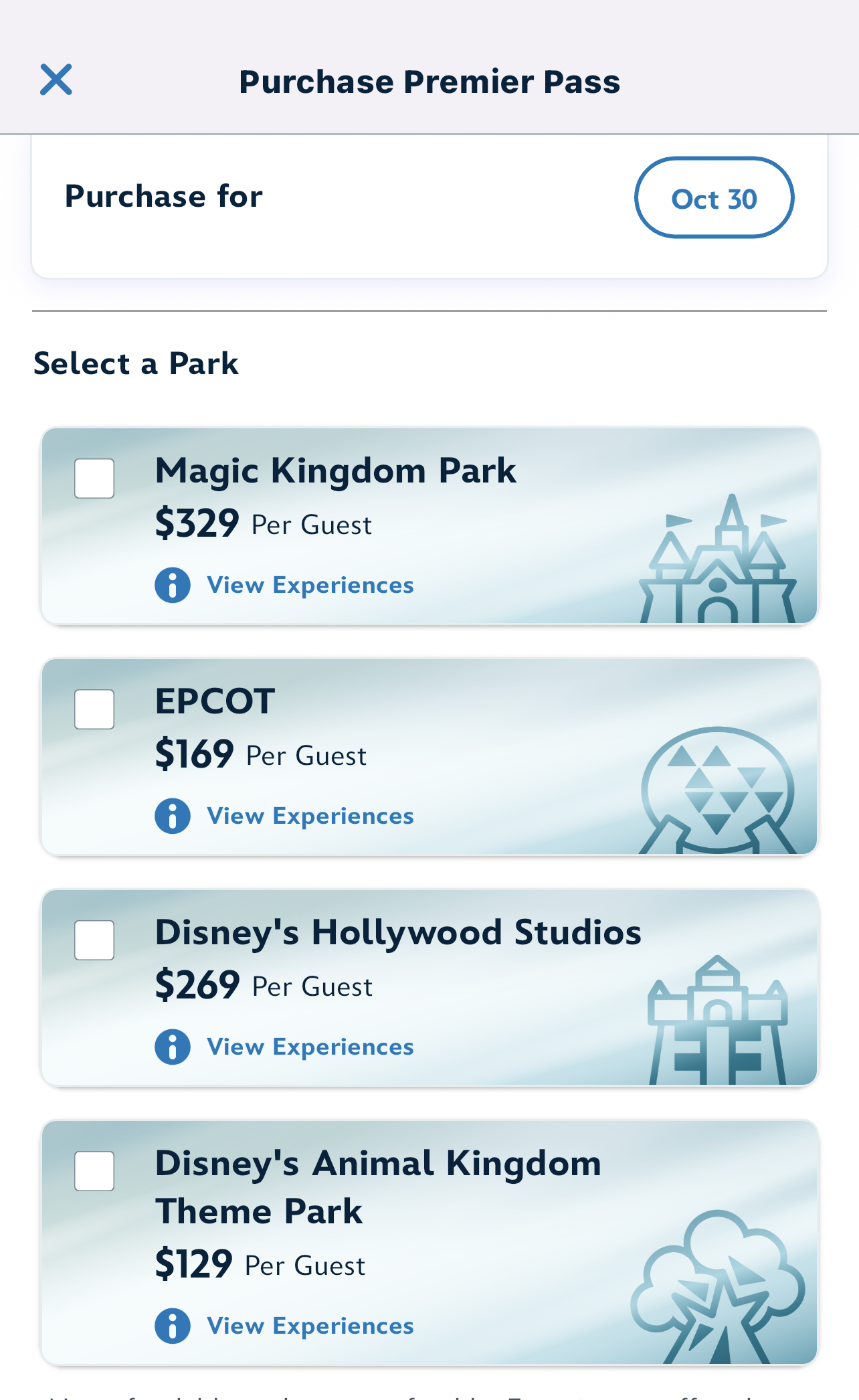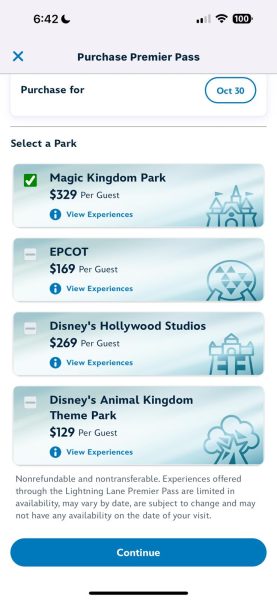 You will then choose the date and park for which you would like to purchase Premier Pass.