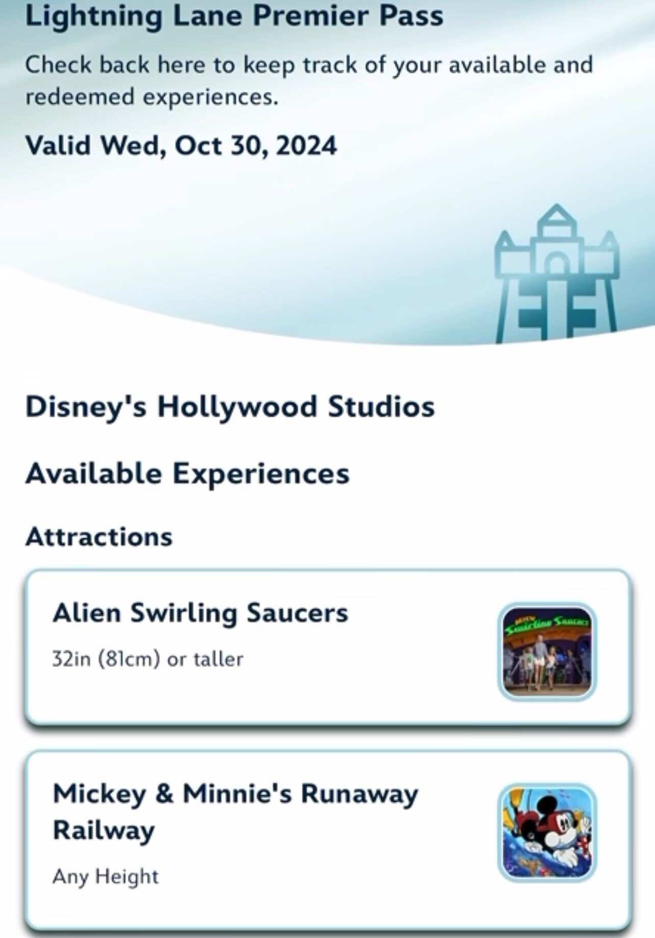 Shows that are included in Lightning Lane Premier Pass show up with all the available times and instruct you to arrive at least 10 minutes early. Under your available experiences, there is a list of redeemed experiences.