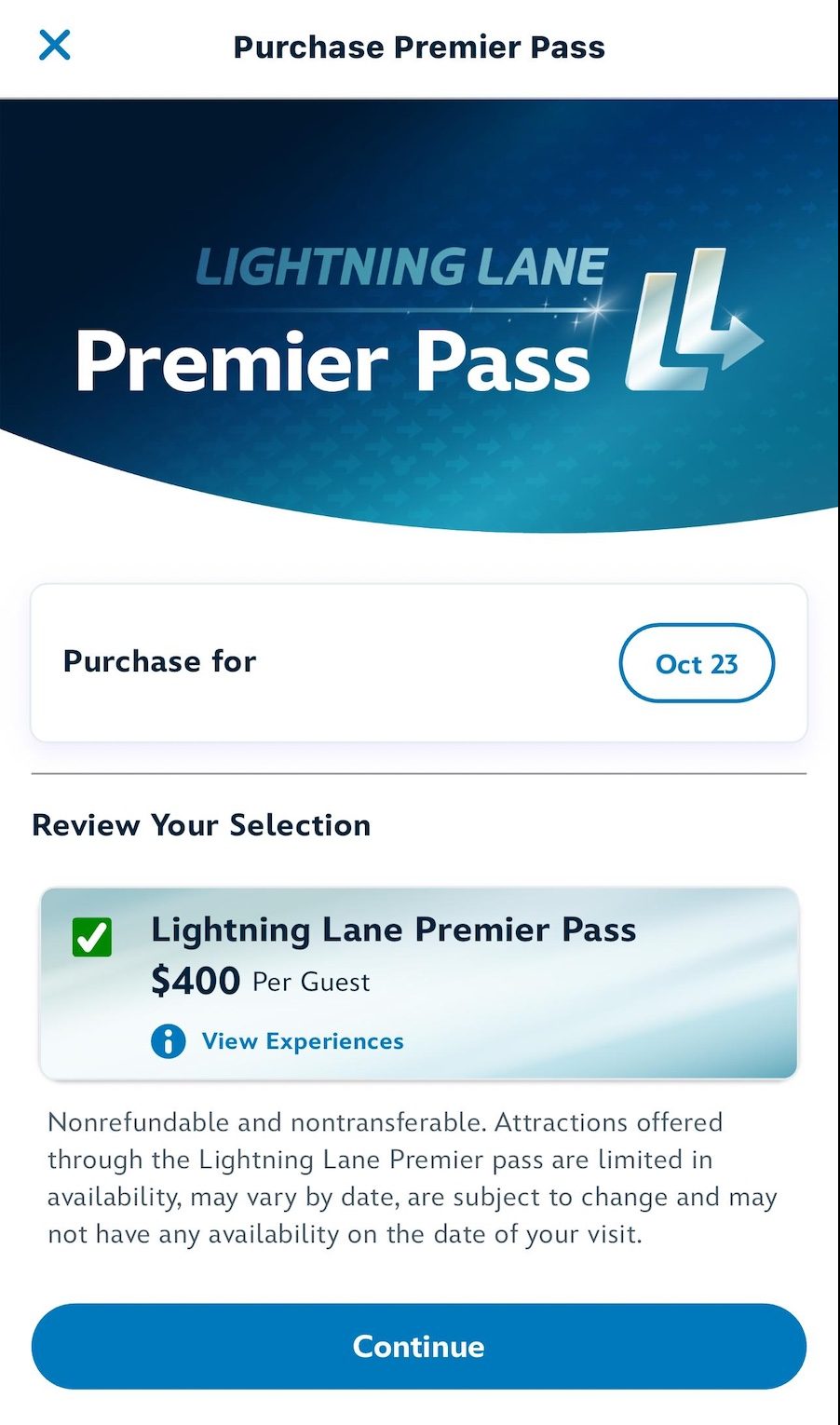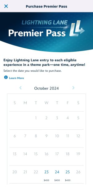 You’ll then see a calendar for the days you can purchase Premier Pass. You can purchase it up to two days in advance. This is also where you’ll see the price of Lightning Lane Premier Pass per date. Choose the date you wish to purchase Lightning Lane Premier Pass.