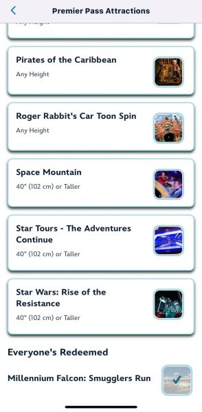 First, open the app and you’ll find the list of available Premier Pass attractions. (See all the inclusions in the next section on this page.) When you visit one of the eligible attractions, you’ll also select it within the app, as you see here with Millennium Falcon: Smugglers Run.