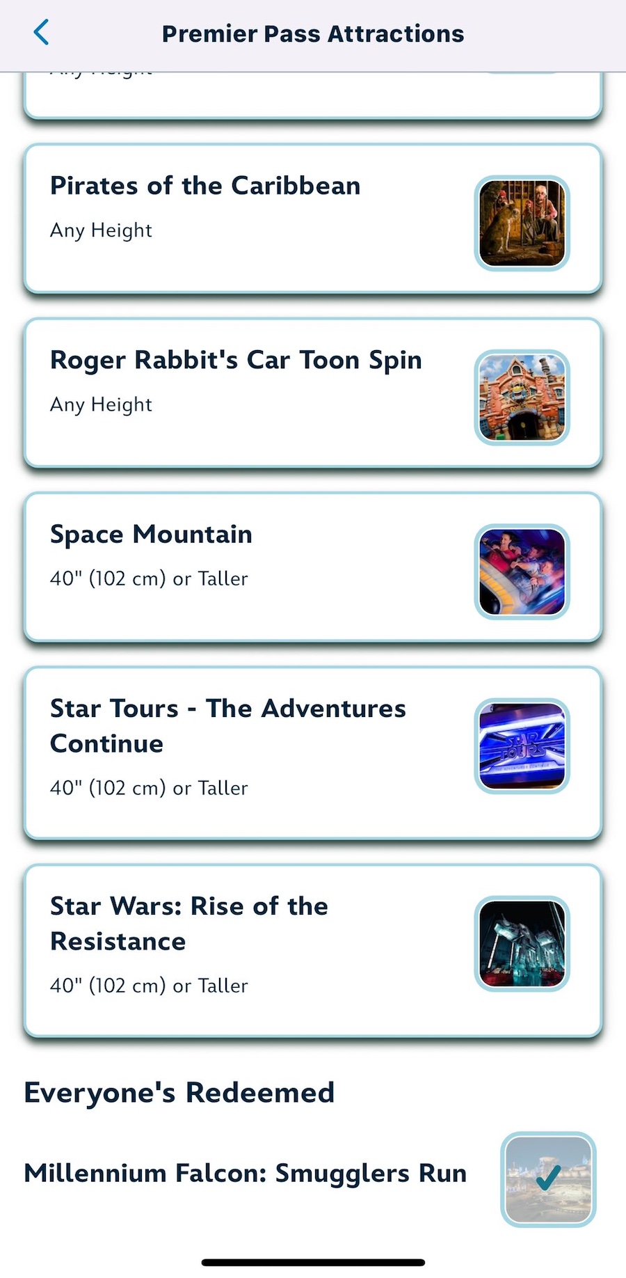 Following the ride, Smugglers Run is “Redeemed” and now unavailable to be selected a second time.