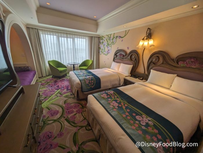 The hotel’s decor befits this regal theming, with guest rooms that are both decoratively and architecturally fantastical, with a rounded style reminiscent of classic Disney animation.