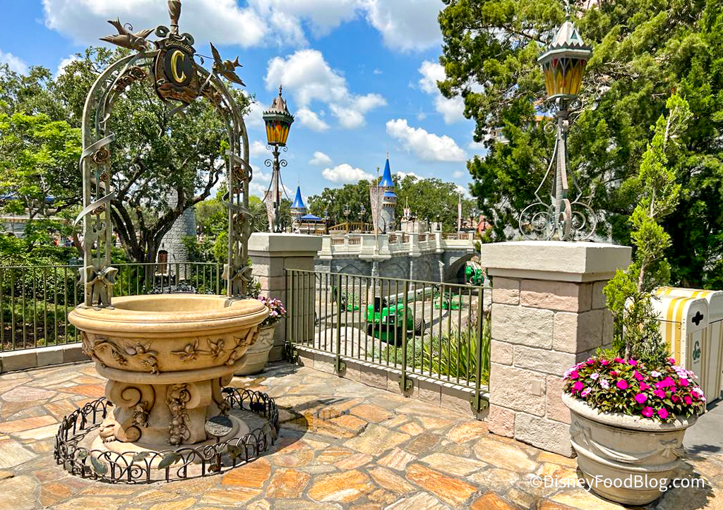 Be sure to make a wish at the Cinderella Wishing Well! Guests will find the wishing well tucked in an alcove on the pathway from Tomorrowland to the right of the castle.