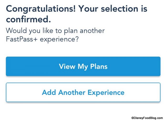 - Upon selection, you can Confirm your choice before having the opportunity to make more FastPasses. (As a reminder, you can select up to 3 FastPasses in one park for each day.)