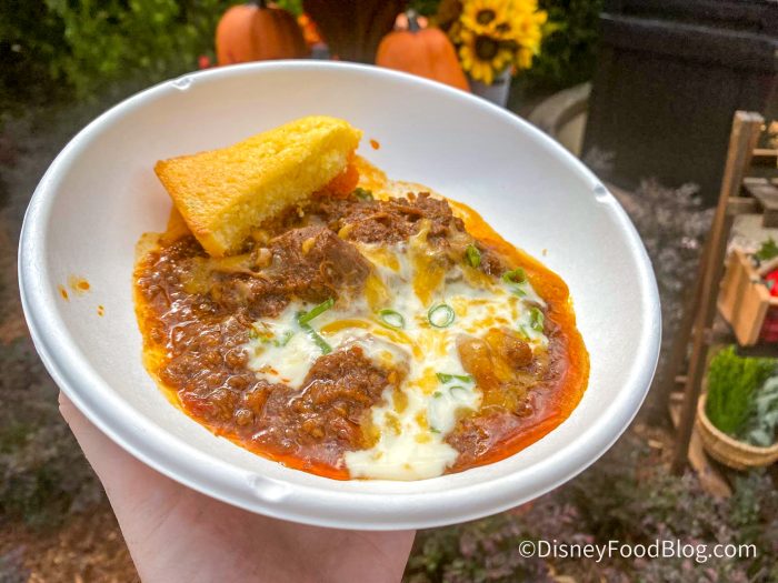 - Autumn Chili with bison, lamb, pork belly, root vegetables, jalapeño cornbread, smoked cheddar, and Crème Fraîche (New) — $7.75, Disney Dining Plan Snack Eligible