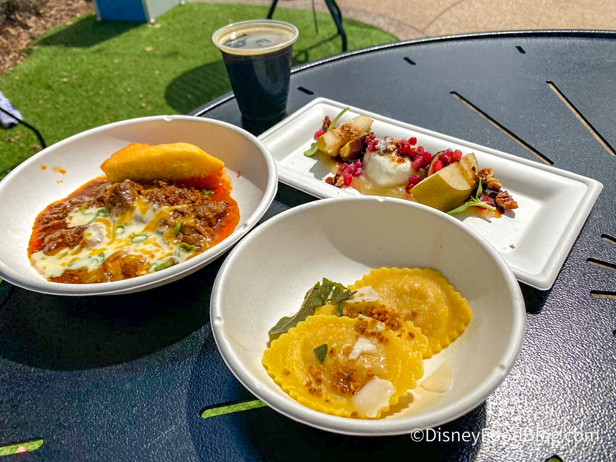 - Pumpkin Mascarpone Ravioli with sage-brown butter, pecorino cheese, and hazelnut praline — Emile’s Fromage Montage item — $5.25, Disney Dining Plan Snack Eligible