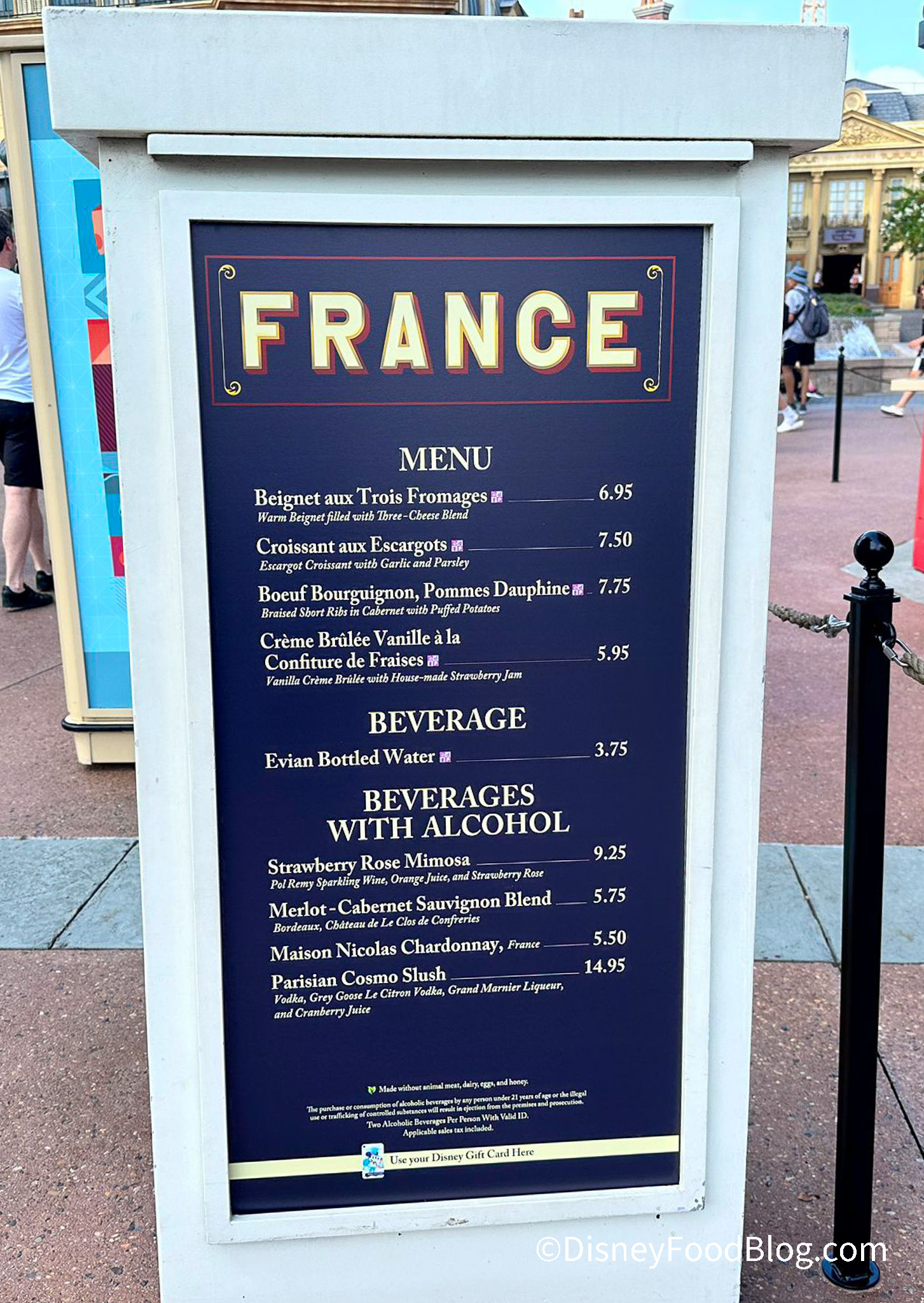 The France Booth is BACK for the 2024 EPCOT Food and Wine Festival! Click HERE for the 2024 Festival Menus!