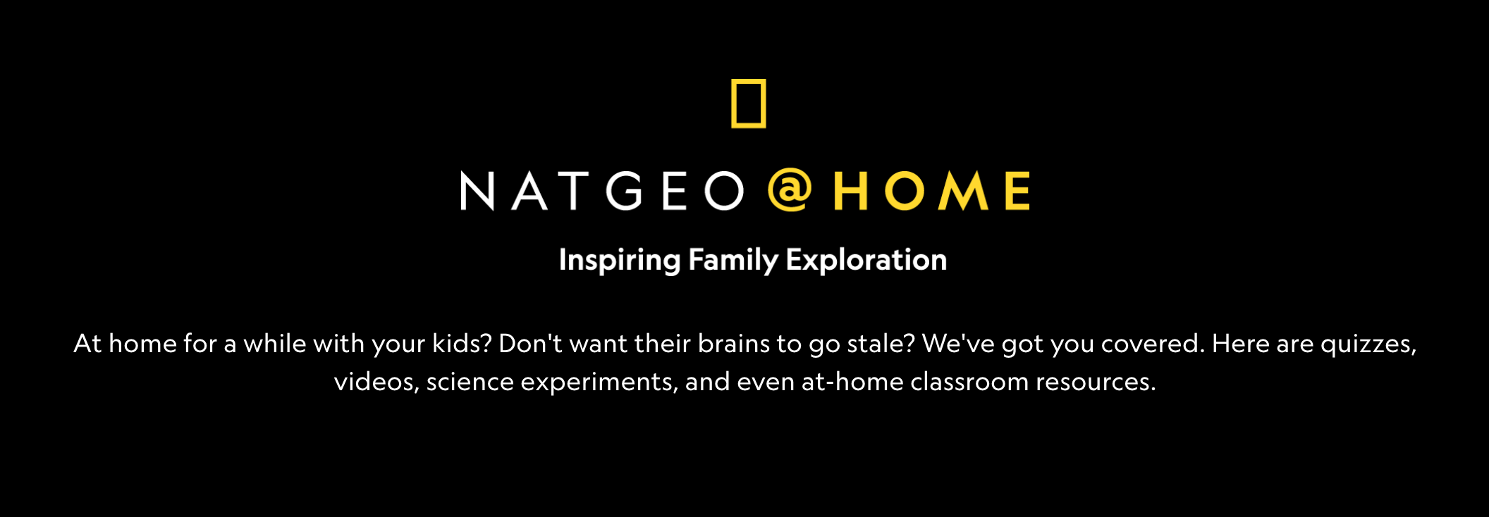 National Geographic’s new website just went live today! It’s called NatGeo@Home and it’s the lifesaver many of us who can’t glue another piece of dried pasta to construction paper need right now!