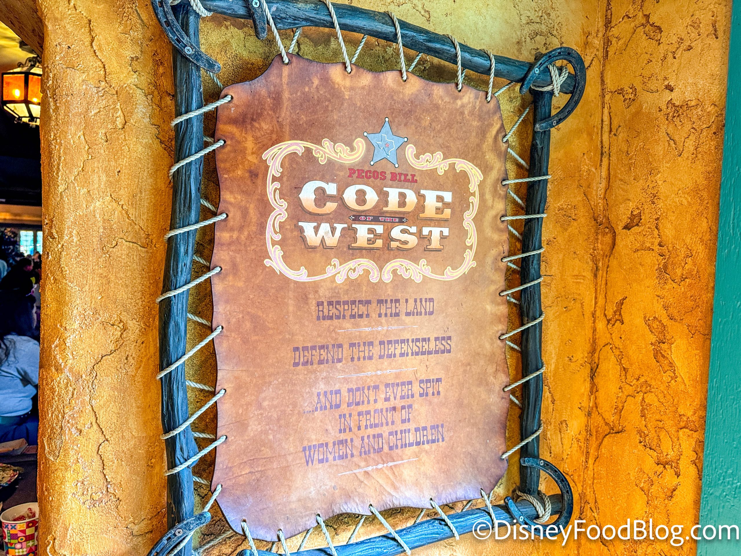 The primary Counter Service location in Frontierland is Pecos Bill Tall Tale Inn & Cafe (established in 1878, of course).