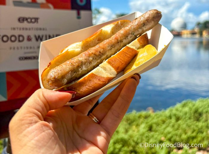 - Bratwurst on a pretzel roll with mustard — $6.25, Disney Dining Plan snack credit eligible