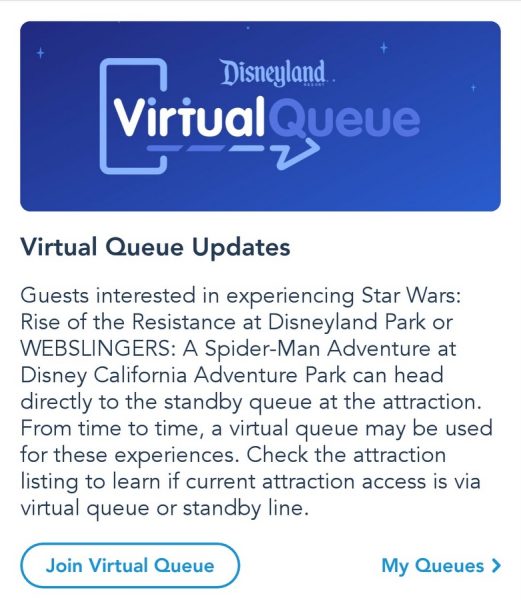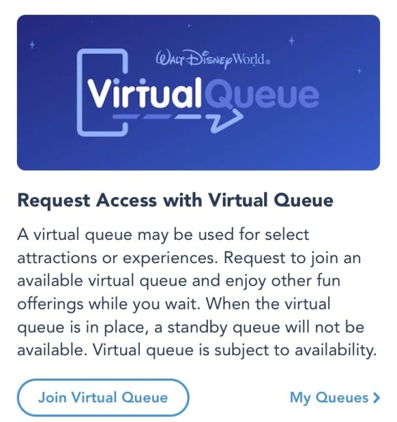 A Virtual Queue is a tool available through the My Disney Experience app (for Disney World) and the Disneyland app (for Disneyland Resort) which allows guests to reserve a space in line for the most popular park attractions. This space is referred to as a Boarding Pass for use within an assigned Boarding Group.