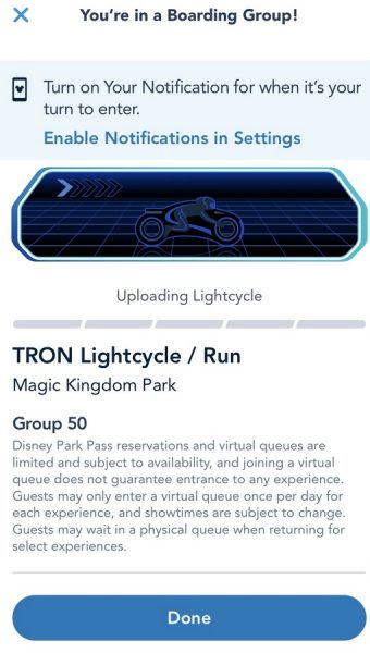 For the purposes of this example, we’re using TRON Lightcycle / Run in Disney World. (Please note that TRON has switched to a Standby line and no longer utilizes Virtual Queue; however, the process is the same for all attractions.)