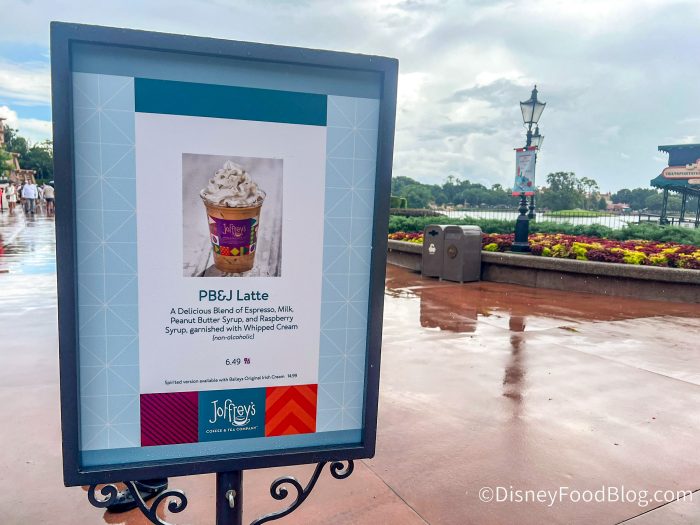 - PB&J Latte: A delicious blend of espresso, milk, peanut butter syrup, and raspberry syrup, garnished with whipped cream (Non-alcoholic) (New) — $6.49, Disney Dining Plan snack credit eligible