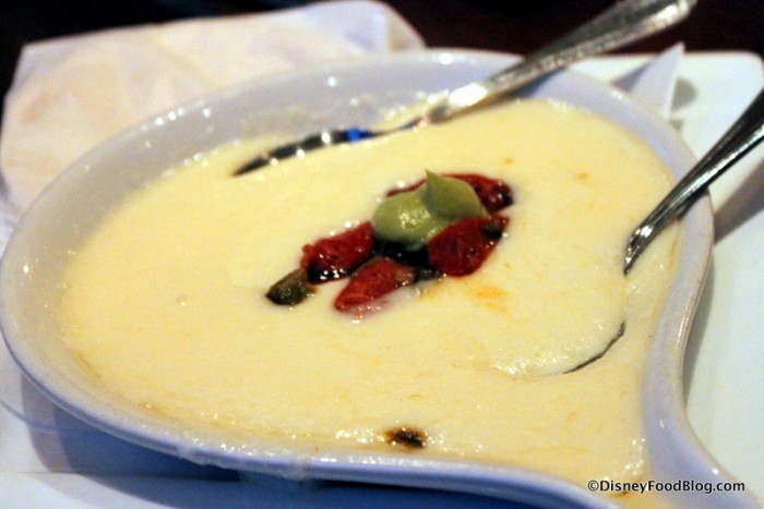 Crema de Elote — Creamy corn soup with spicy tortilla strips and Mexican sour cream