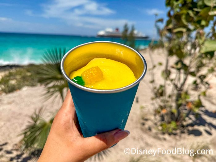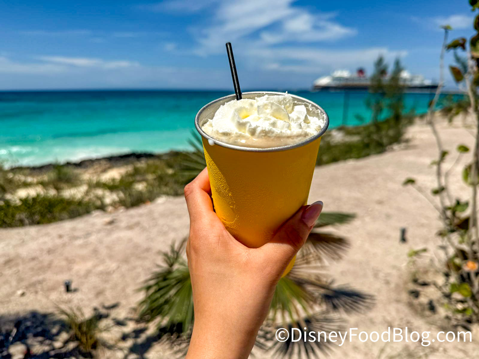 The Disney Lookout Cay signature cocktail is the Eleuthera Euphoria featuring premium aged rum, pineapple smoothie mix, and DOLE Whip!
