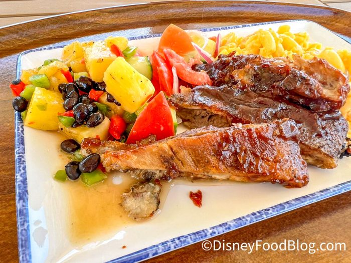 - Grilled BBQ Ribs with “smoky BBQ” sauce, grilled corn, and yucca fries