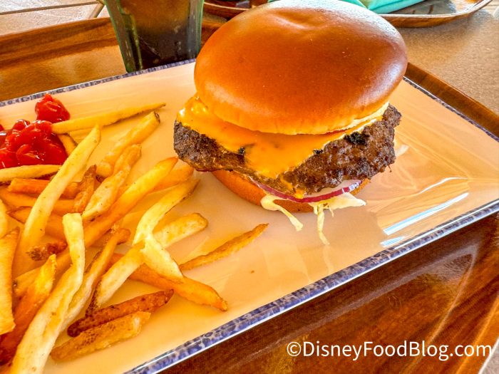 - Grilled Cheeseburger on a brioche bun with shredded iceberg lettuce, red onion, tomatoes, and pickles with french fries with American coleslaw