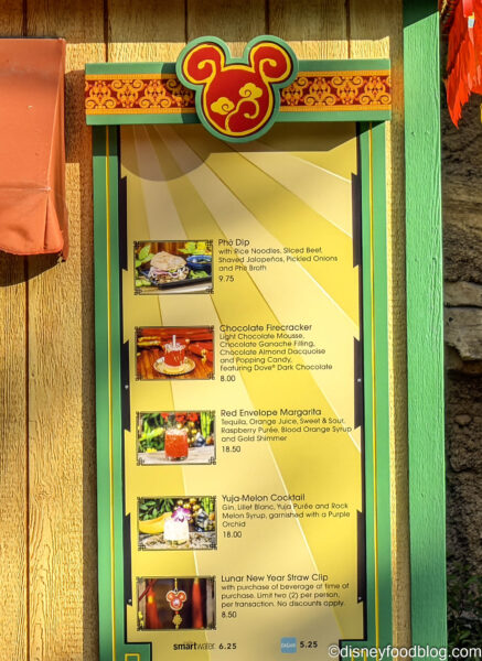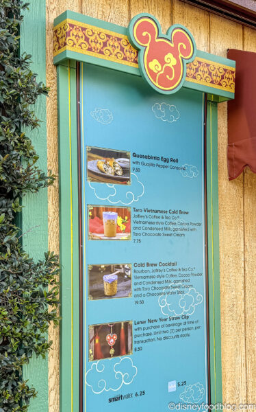 The Sip and Savor Pass is a souvenir credential which includes six digital coupons, each of which are eligible for one food item or non-alcoholic beverage per credit at the Lunar New Year Marketplaces and select items at the Additional Locations as designated above per restaurant. The Sip and Savor Pass costs $49, and Disneyland Resort Magic Key holders are eligible for a discount, bringing the cost to $46.