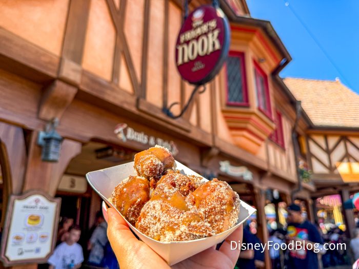Sleepy Hollow Refreshments offers eats that you won’t find anywhere else in the park… or in Disney World, for that matter! From famous funnel cakes to sweet or savory Waffles and Hand-dipped Corn Dogs, this small spot boasts BIG tastes.