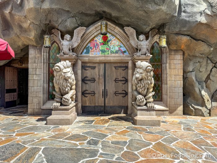 Gaston’s Tavern is a counter service eatery located near the Beast’s Castle in Fantasyland, and it’s a tribute to Gaston (placed there by… himself) from Disney’s Beauty and the Beast. As guests walk up to this French Village Pub, an enormous outdoor statue showcases this character with a huge ego!
