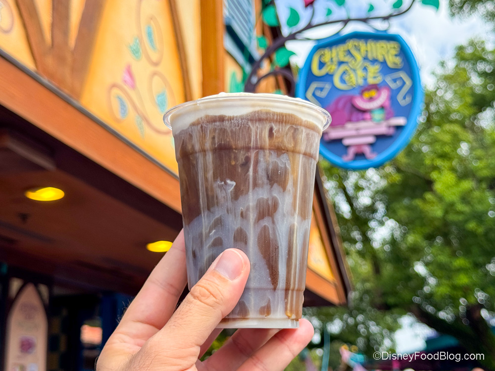 The whimsical kiosk serves up a small menu of frozen slushes and cold brews perfect for hot days and a few snacks, including the signature Cheshire Cat Tail.