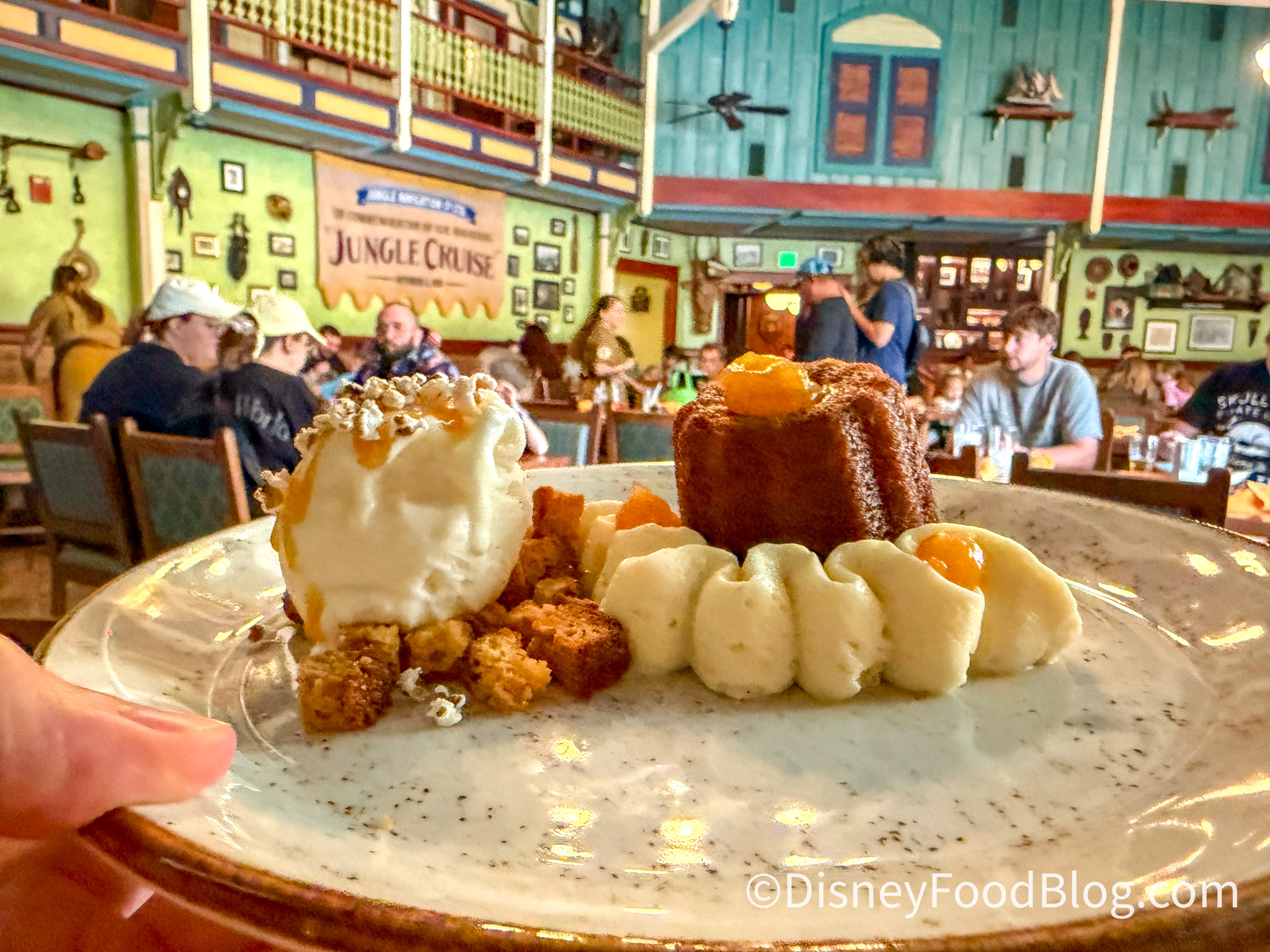 The Skipper Canteen features three dining rooms, including the Falls Family Parlor, the Crew Mess Hall, and a once-secret meeting room of the Society of Adventurers and Explorers. In these rooms, guests dine on “World Famous Jungle Cuisine” with Asian, South American, and African-influenced dishes.