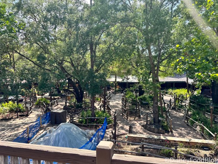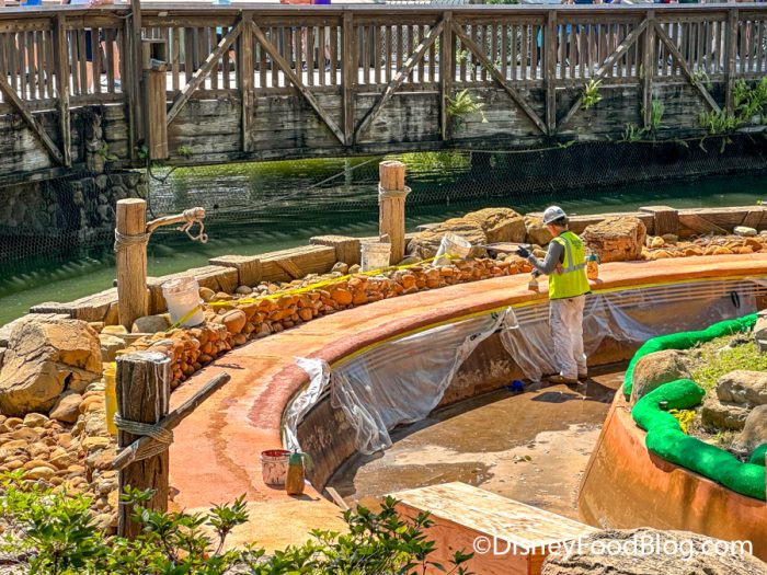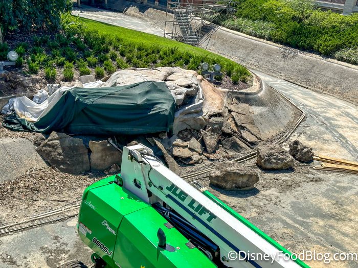 In the past few days, it looks like more work has continued near the bottom of the ride’s hill, with tarps and scaffolding ready in the path of the log flume.