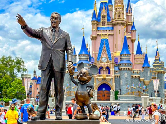 From here, guests head towards the Hub where the Partners statue — a tribute to Walt Disney and Mickey Mouse — stands in front of the stunning Cinderella Castle.