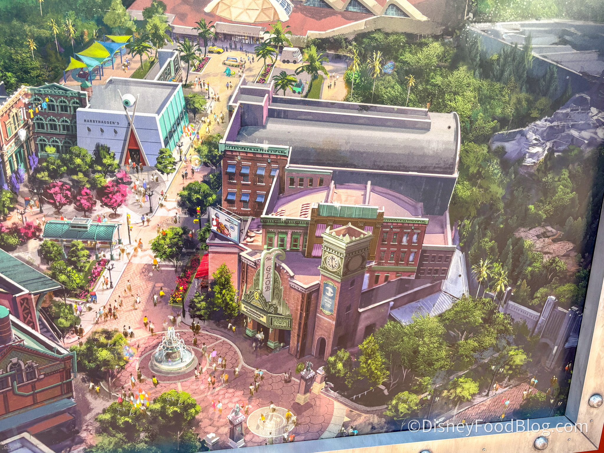 We’ve noticed something upon exploring the concept art drawings for Monsters, Inc. Land. When zooming in you can see the iconic eyeball sculpture that is in front of Harryhausen’s in the Monsters, Inc. movie.