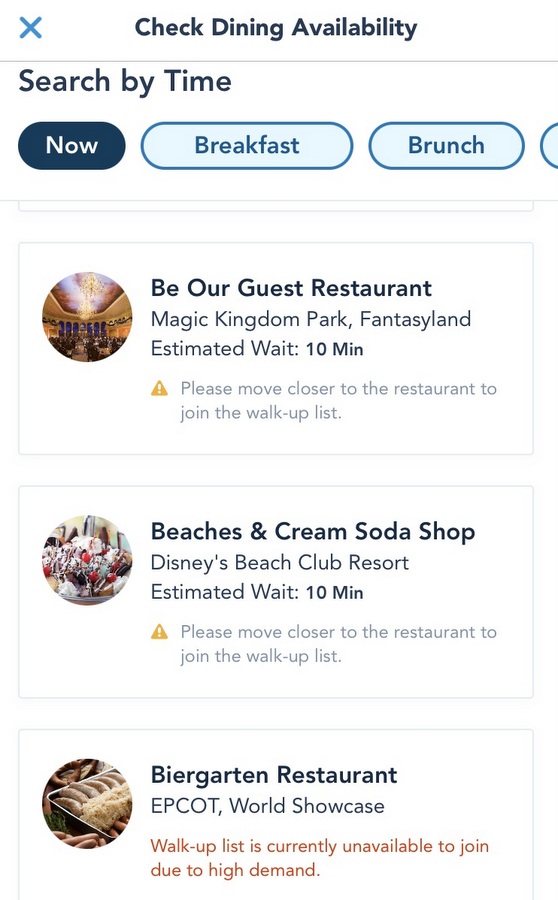 If you are hoping to dine at a Table Service restaurant, but do not have an Advance Dining Reservation, select restaurants offer the Mobile Dine Walk-up Waitlist feature.