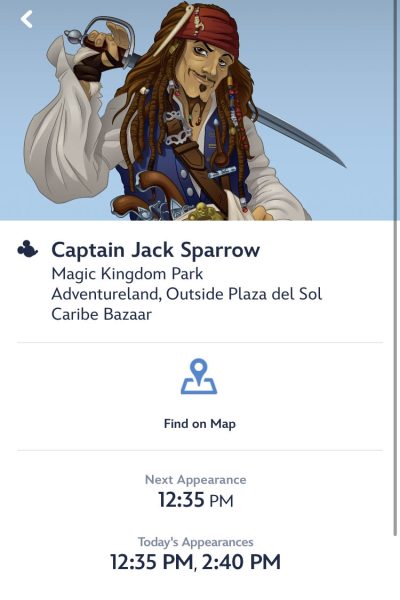 Say you’d like to meet Jack Sparrow, for instance… when you see him appear on the list, simply click to find the times he’ll be making appearances!