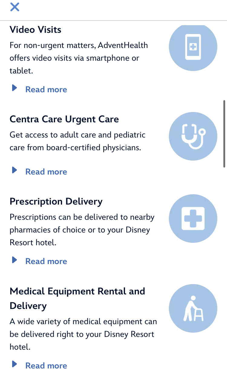And as part of Disney’s partnership with AdventHealth, there is a section on the app called Guest Care Health Services. You can find it by typing “Advent” in the app’s Search Tool.