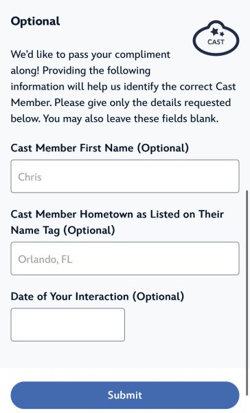 To leave a mobile Cast Compliment, open the app and search “Cast Compliment.” From there, you can enter the reason for your compliment, the location, name, hometown, and date of your interaction so that they can be recognized for their amazing work!