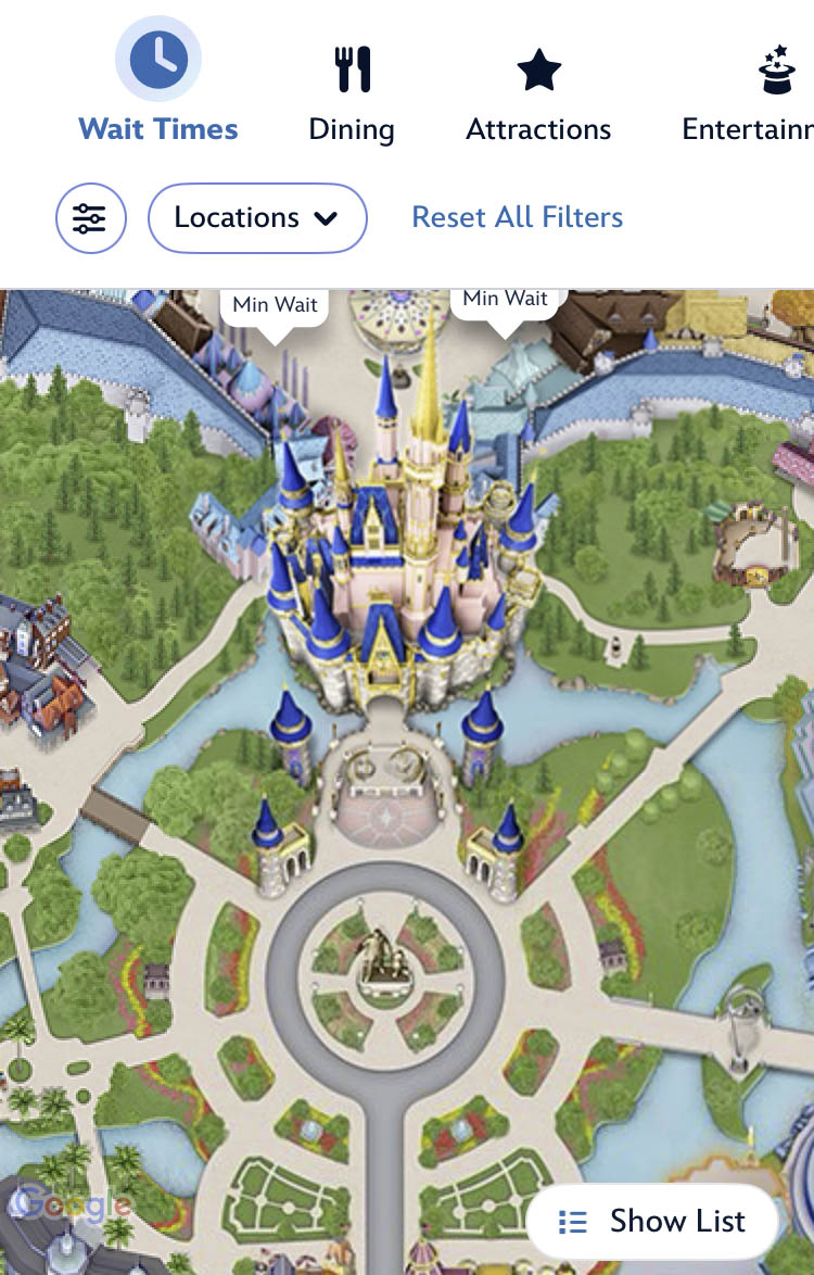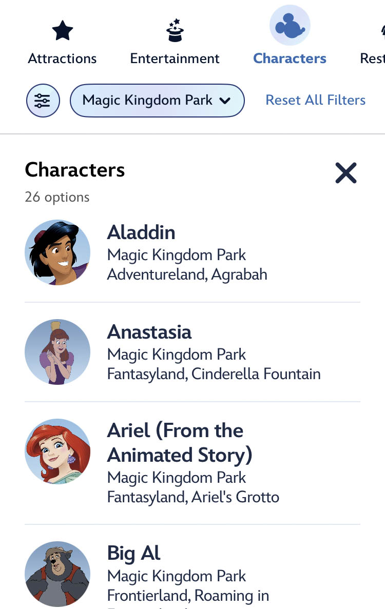 And to help make the most of your time, you can view park hours, attraction Wait Times, entertainment options and show times, attraction refurbishment schedules, and more. You can even find information and wait times for Character Meet and Greets, and filter by the park you are currently in.