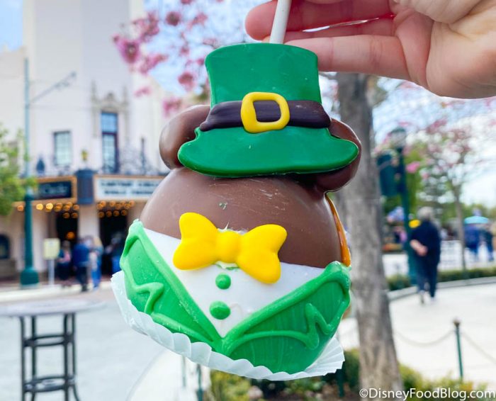 Look who got all decked out for the occasion: it’s the St. Patrick’s Mickey Apple! This is a Granny Smith apple coated in caramel and milk chocolate, with white chocolate details and marshmallow ears. ($11.99 at Trolley Treats)