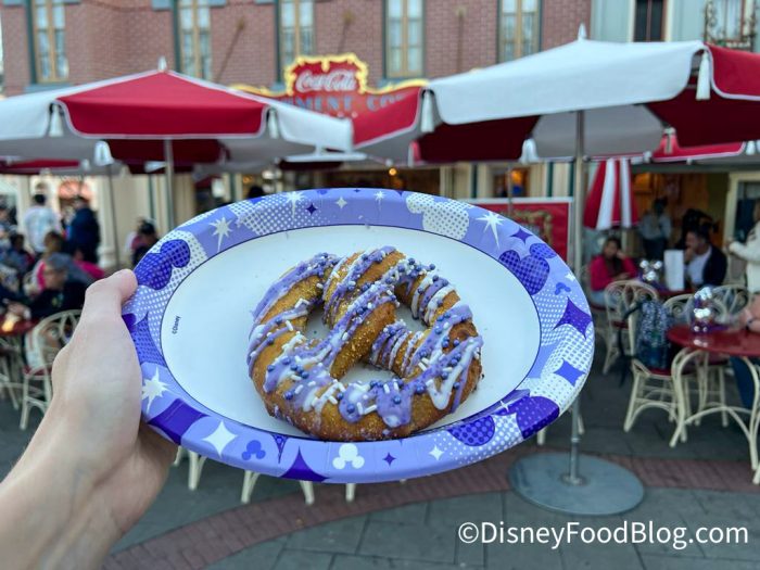 The Disney100 Churro is a classic Disneyland Churro rolled in cherry sugar served with white icing and topped with purple and silver pearls.