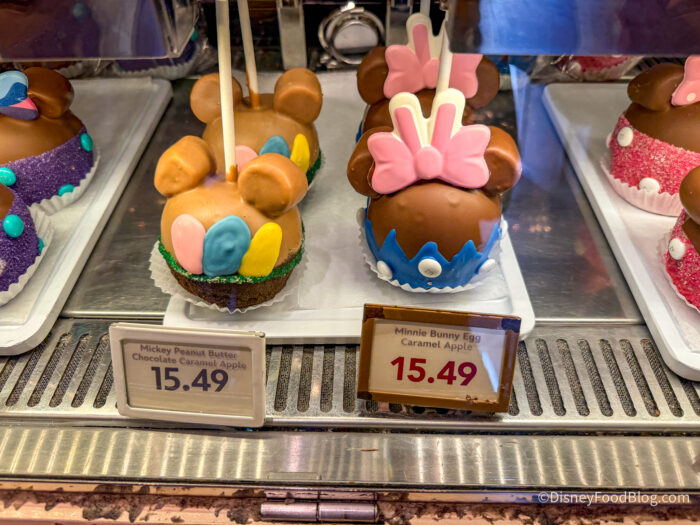 - Bunny Caramel Apple: Granny Smith Apple with marshmallow dipped in white chocolate and decorated with dark chocolate, pink-colored white chocolate, and pink and white bunny ears chocolate piece (Not available at Disney Wonderful World of Sweets)