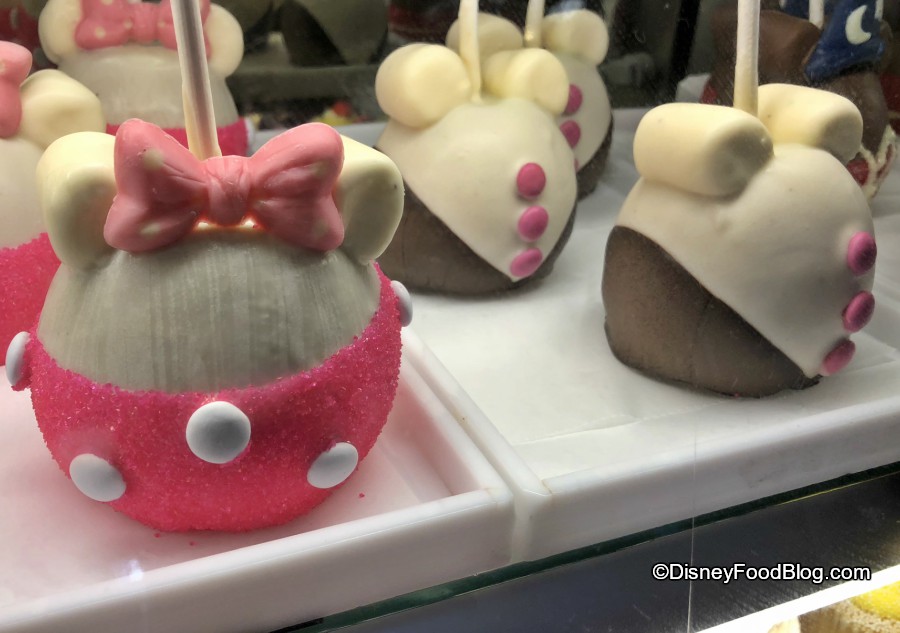 - Pink Minnie Caramel Apple: Granny Smith apple dipped in caramel with two Minnie marshmallow ears covered in milk chocolate, pink sanding sugar dress, and white M&M’S Milk Chocolate Candies with a white polka-dotted chocolate bow