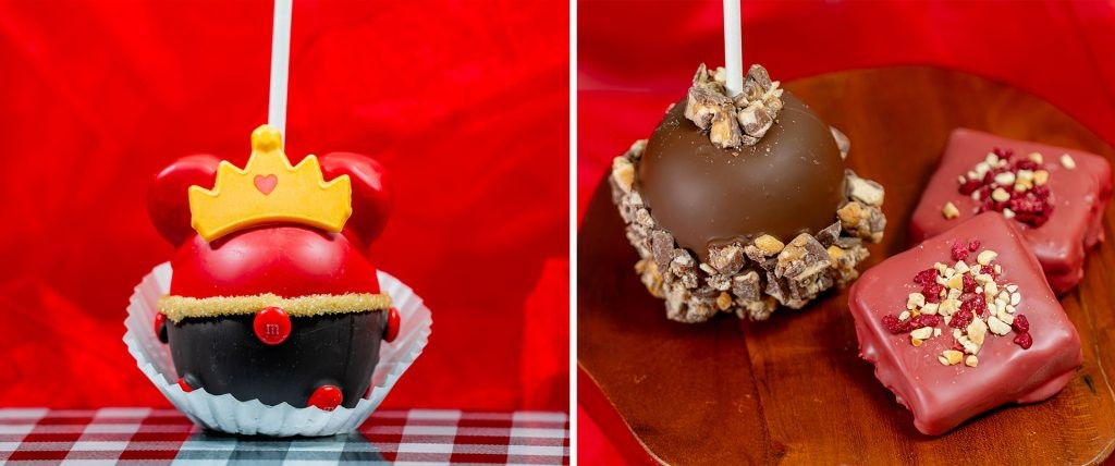 - Queen of Hearts Caramel Apple: Granny Smith apple dipped in caramel and decorated with red-colored white chocolate, marshmallow ears, a black-colored dark chocolate dress, red M&M’S Milk Chocolate Candies, and a shimmery gold crown with a heart in the middle (New)