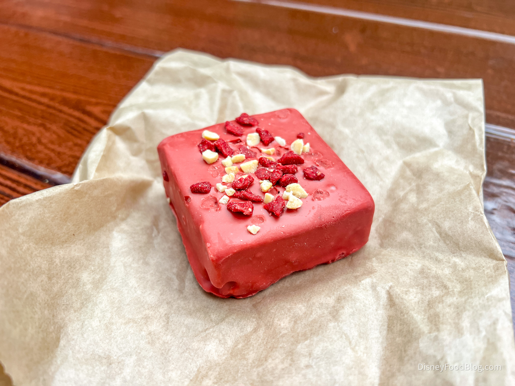 - Raspberry Peanut Butter Square: Peanut butter and white chocolate square dipped in raspberry-flavored white chocolate and decorated with chopped peanuts and freeze-dried raspberry crisps (New)