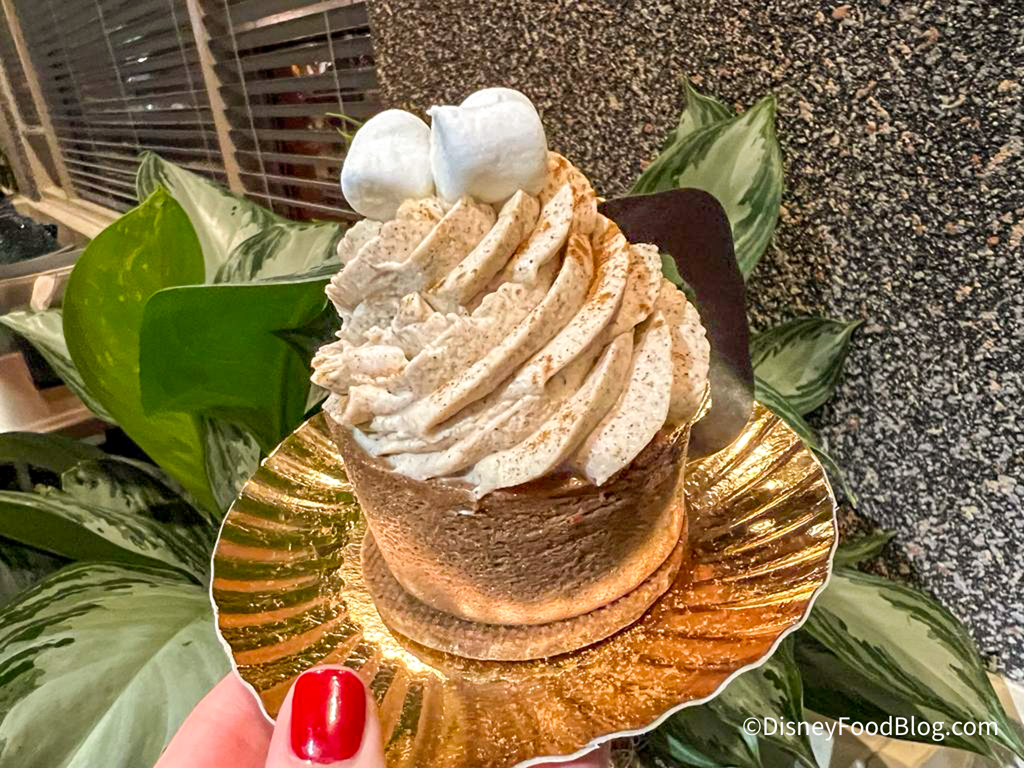 A chocolate brownie, cherries, and white chocolate chips come together and are decorated with fudge buttercream and topped with a caramel-chocolate Duffy paw print to make a tribute-in-a-snack to Mickey’s teddy bear pal! It’s $5.99.