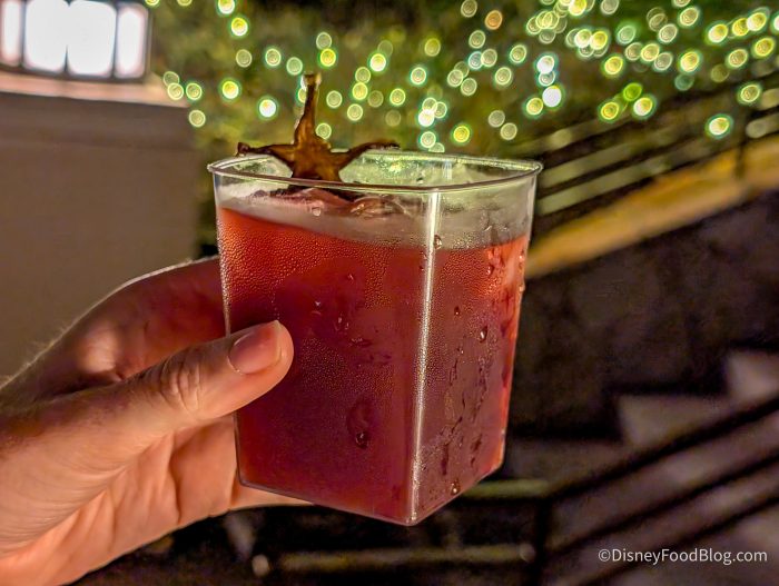 Fireball Cinnamon Whisky, red wine, apple cider, Minute Maid Orange Juice, and lemon and lime juices make up the base, and it’s all garnished with a star fruit chip.