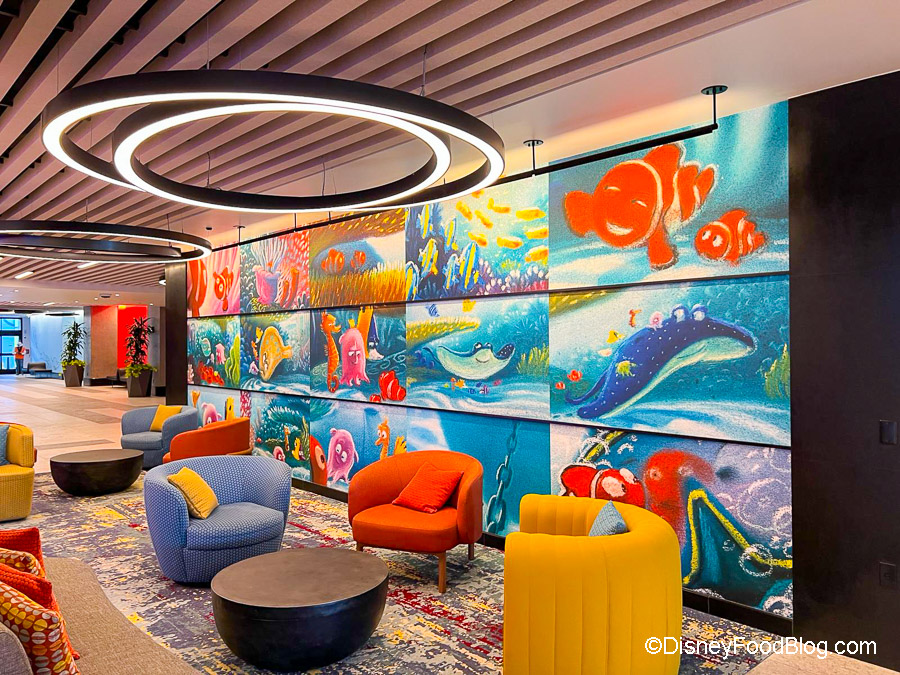 There are so many little Pixar touches everywhere you look. For instance, an area of the lobby is dedicated to Soul, where you can check out a mural inspired by the movie as well as listen to JOE GARDNER from Soul!