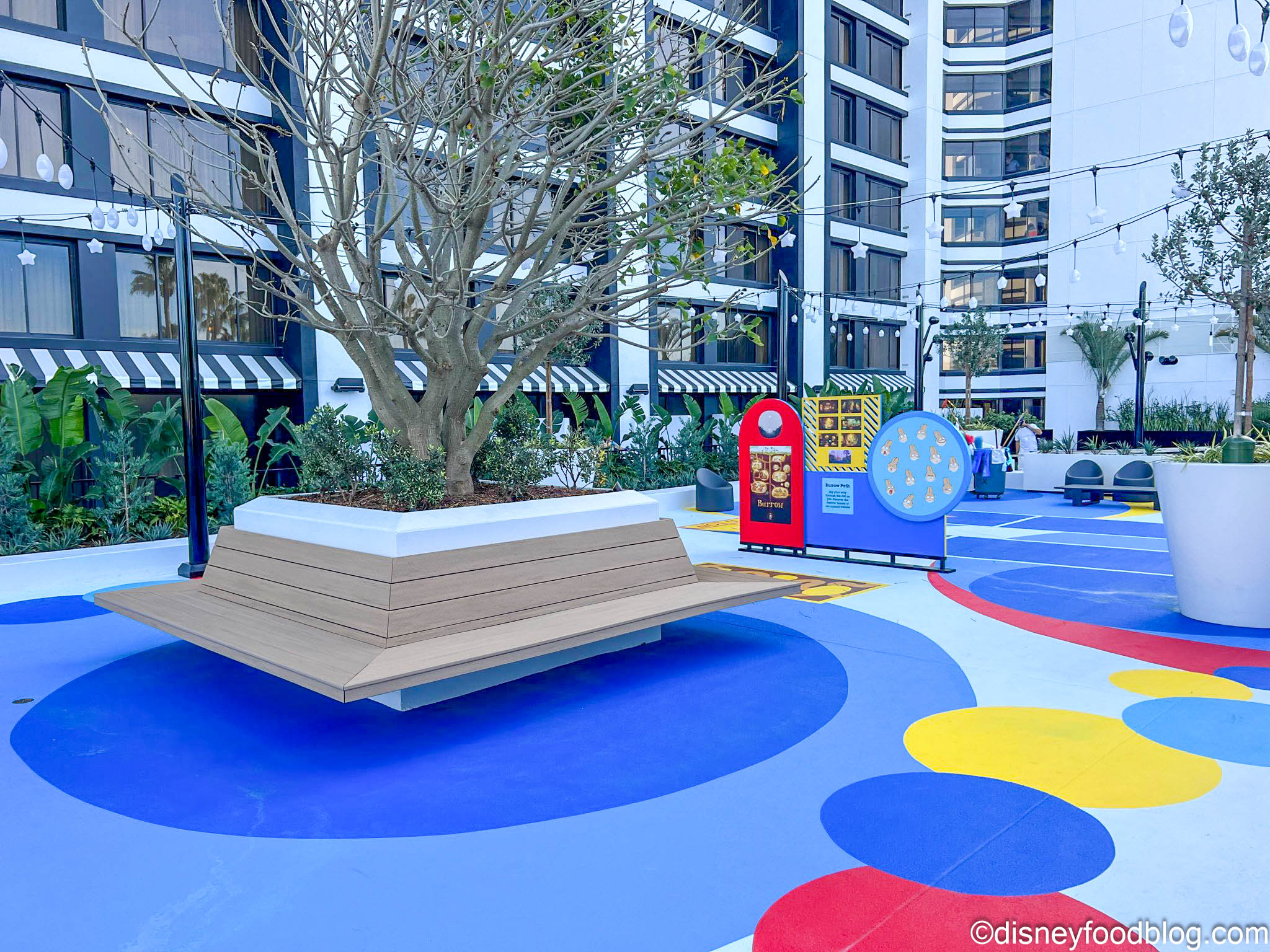 The outdoor seating is spacious yet cozy, and follows a more subtle Pixar theming with colors that are reminiscent of the classic Pixar films like Toy Story.