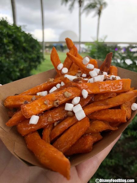 - Sweet Potato Poutine: Sweet Potato Fries with Caramel Sauce, Mini Marshmallows and Pecans (V) – $7.49, DDP Snack Eligible