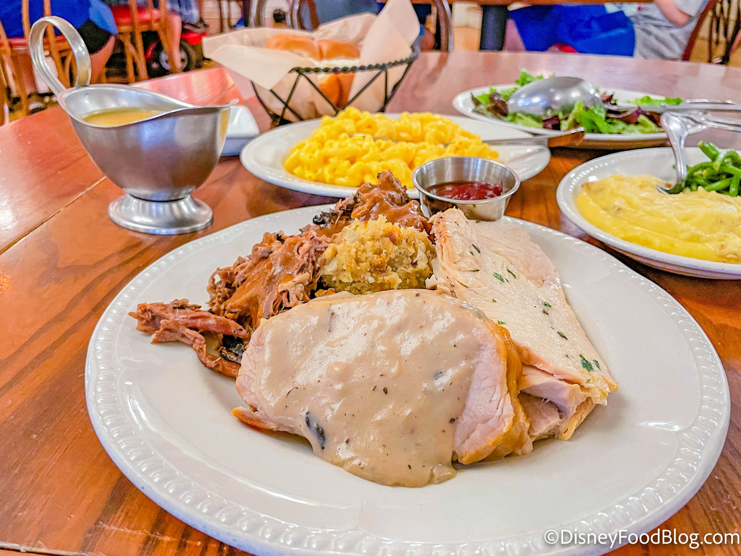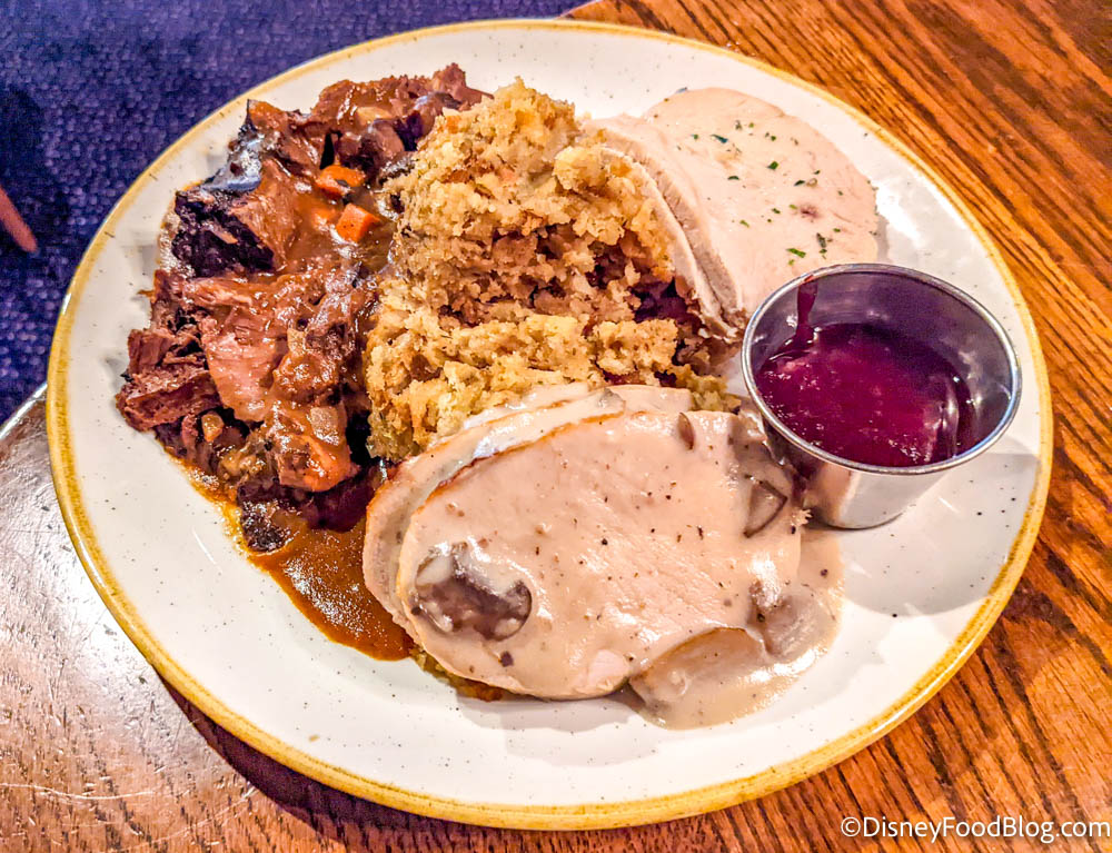 The menu features items like pot roast, roasted turkey breast, oven-roasted pork, mashed potatoes, seasonal vegetables, mac & cheese, and herb stuffing. There are even options for special diets like plant-based, gluten-, and dairy-free eaters. Don’t skip dessert either — that Ooey Gooey Toffee Cake is one of our favorite desserts in Magic Kingdom!