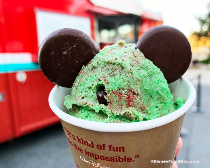 The Santa Mickey Waffle Sundae is made with a red velvet waffle, topped with mint-chip ice cream, seasonal sprinkles, chocolate sauce, and peppermint powder. While we were hoping for a little more with this one, we’d be interested to hear your thoughts – maybe we just got a bad batch! Available for $7.79 at Sleepy Hollow.