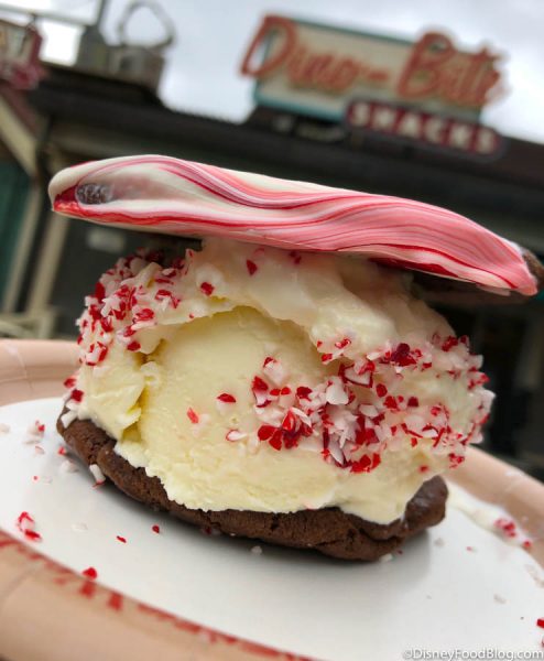 This massive treat features vanilla ice cream that is served between double chocolate cookies and then rolled in peppermint candy bits. As if that wasn’t perfect enough, one of the cookies is dipped in red-swirled white chocolate. This is one of the BEST holiday treats we’ve had all year! Available for $6.99 at Dino-Bite Snacks.