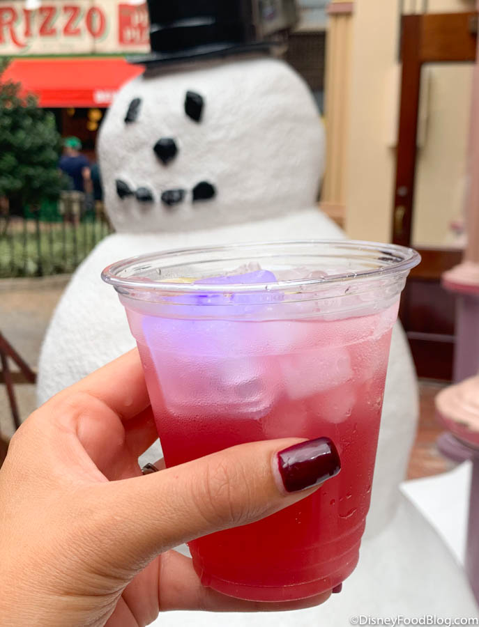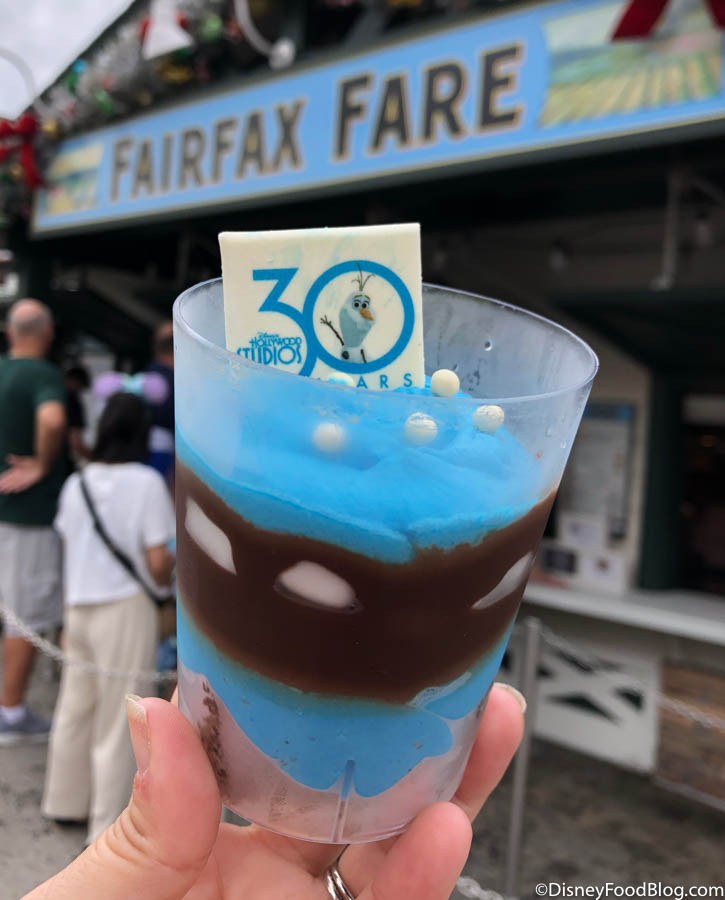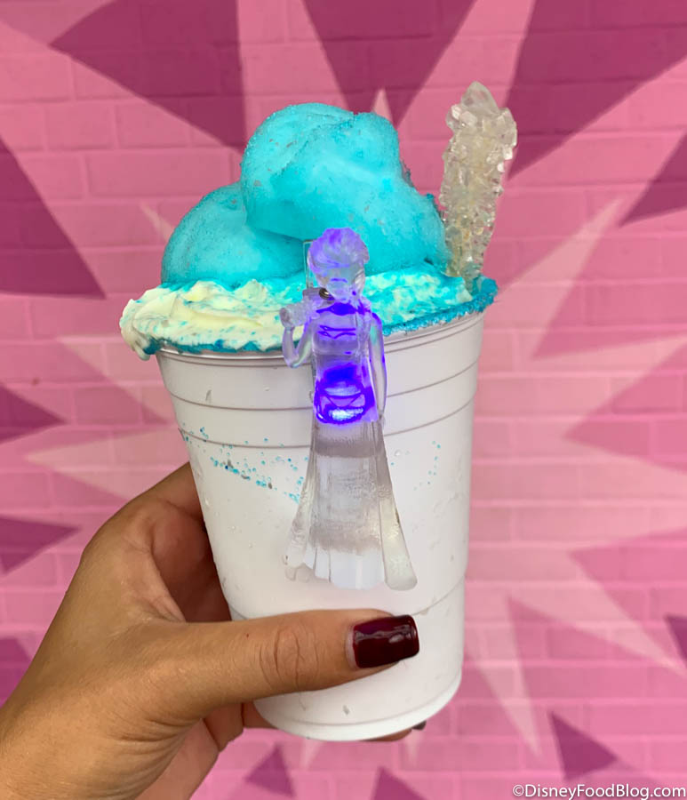 We know, there is a LOT going on here. It features a blue raspberry frozen slushy topped with whipped cream, blue sugar, cotton candy, and a rock candy sugar cane (oh, and a light-up Elsa Glow Clip rests on the side, no big deal). This eyeful of a treat is available for $10.79 at the Market.